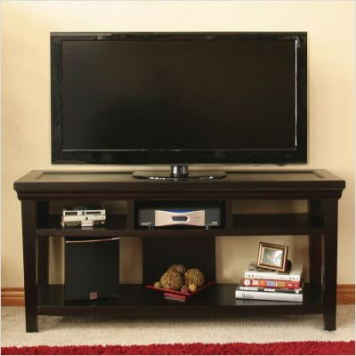 61166 This iconic entertainment table performs a dual function in any home. While highlighting the look of most room settings, this table easily accommodates up to three audio/video components. The strategically placed back panel allows for an open look while creating an avenue to conceal your power cords. Features: -TV stand. -Mocha finish. -Rich, hand rubbed, multi step and deep finish. -Solid hardwood and veneer construction. -Smooth sculptured wood craft provides a 4.5'' top edge. -Accommodates up to three audio or video components. -Easily supports up to 60'' televisions. -Strategically placed back panel helps conceal power cords. -Assembly required.