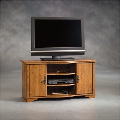 403891 Sophisticated hardware decorates doors and drawers. The cabinetry design is classic and clean for media, display and storage. All pieces feature modern technology solutions while maintaining the irresistible warmth and mood with the golden tones of our new Abbey Oak finish. Features: -Entertainment Credenza. -Harvest mill collection. -Abbey oak finish. -Holds TV weighing 95 lbs or less. -Storage area beneath door has an adjustable shelf and holds CDs and DVDs. -Two adjustable shelves hold audio and video equipment. -Accented with solid wood detailing. -Has unique curved design. -Made in USA. -Assembly required. -Manufacturer provides 5 year warranty.